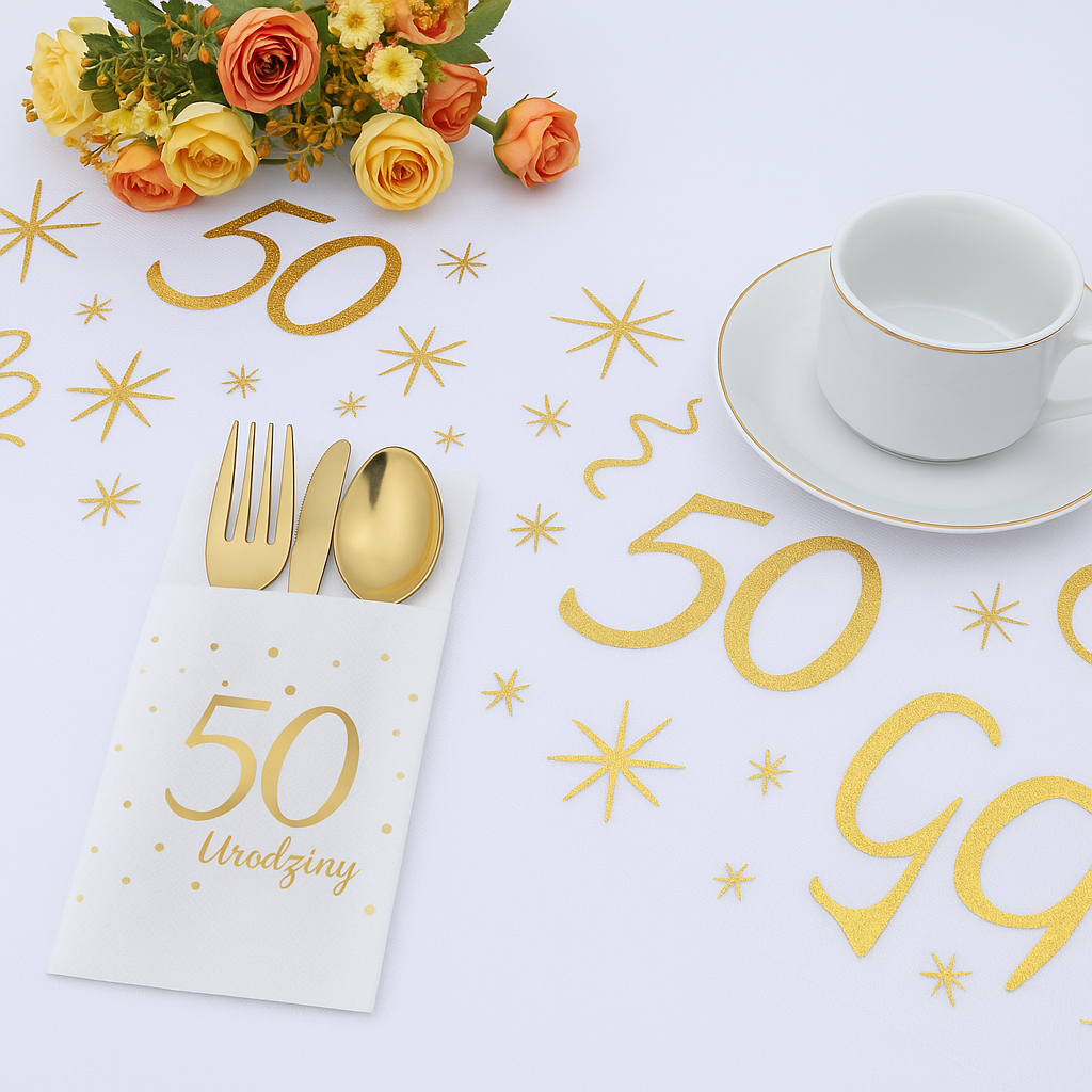 - 12 × kieszonka dekoracyjna na sztućce z dopasowanym nadrukiem „50”