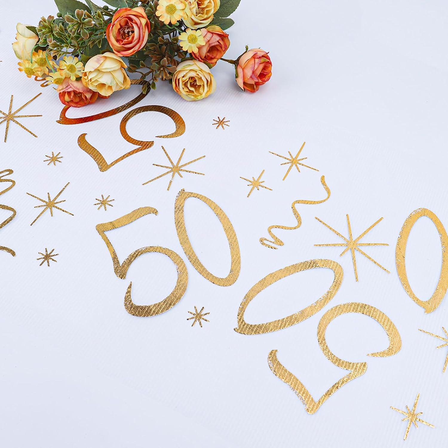 Elegancki zestaw dekoracyjnych elementów stołowych w biało-złotej kolorystyce z motywem liczby „50”. Spójna forma oraz subtelny połysk tworzą estetyczną oprawę stołu, która dobrze prezentuje się w aranżacjach klasycznych i nowoczesnych.