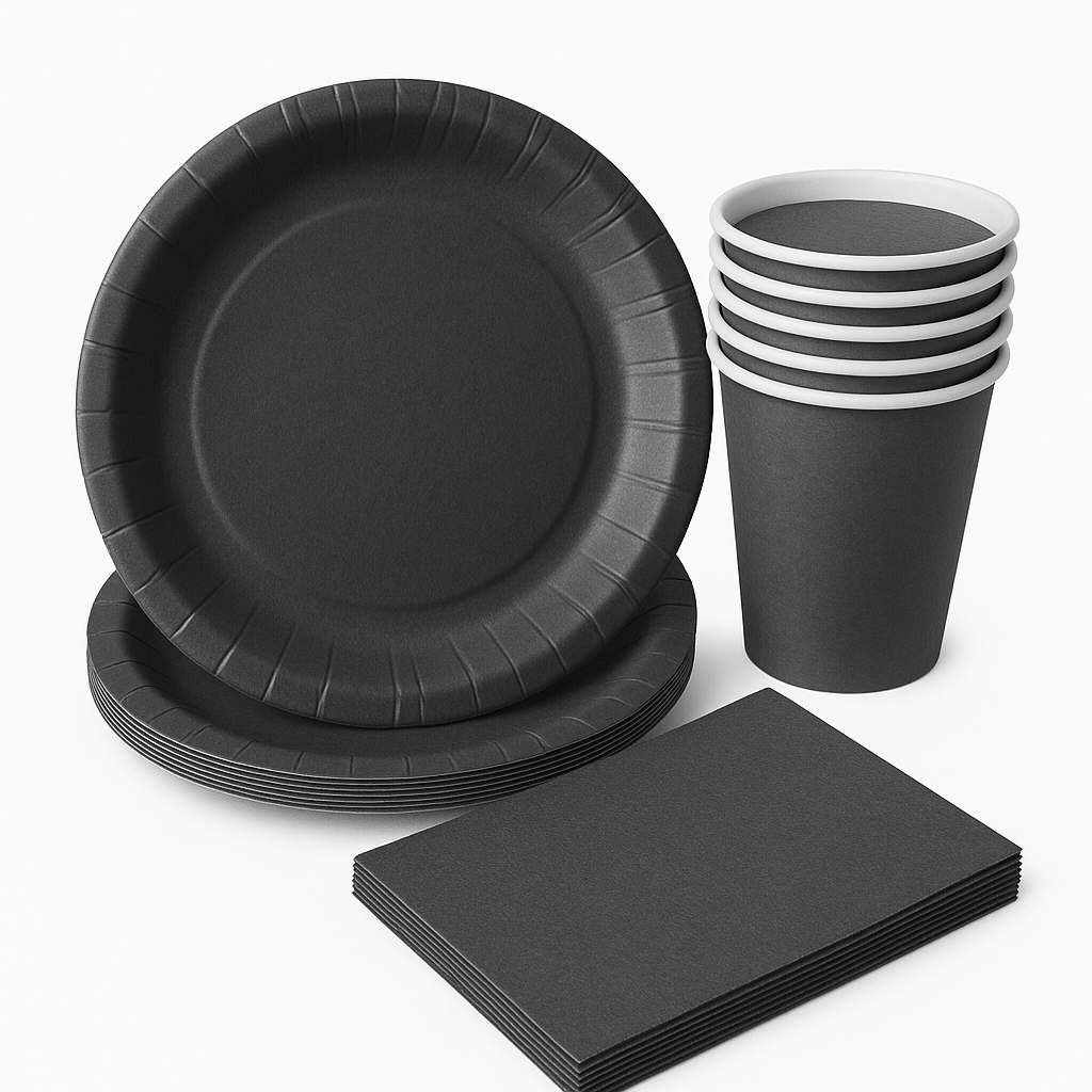 Zestaw Imprezowy – Czarny (Serwetki 20 szt., Kubki 6 szt., Talerzyki 6 szt.)