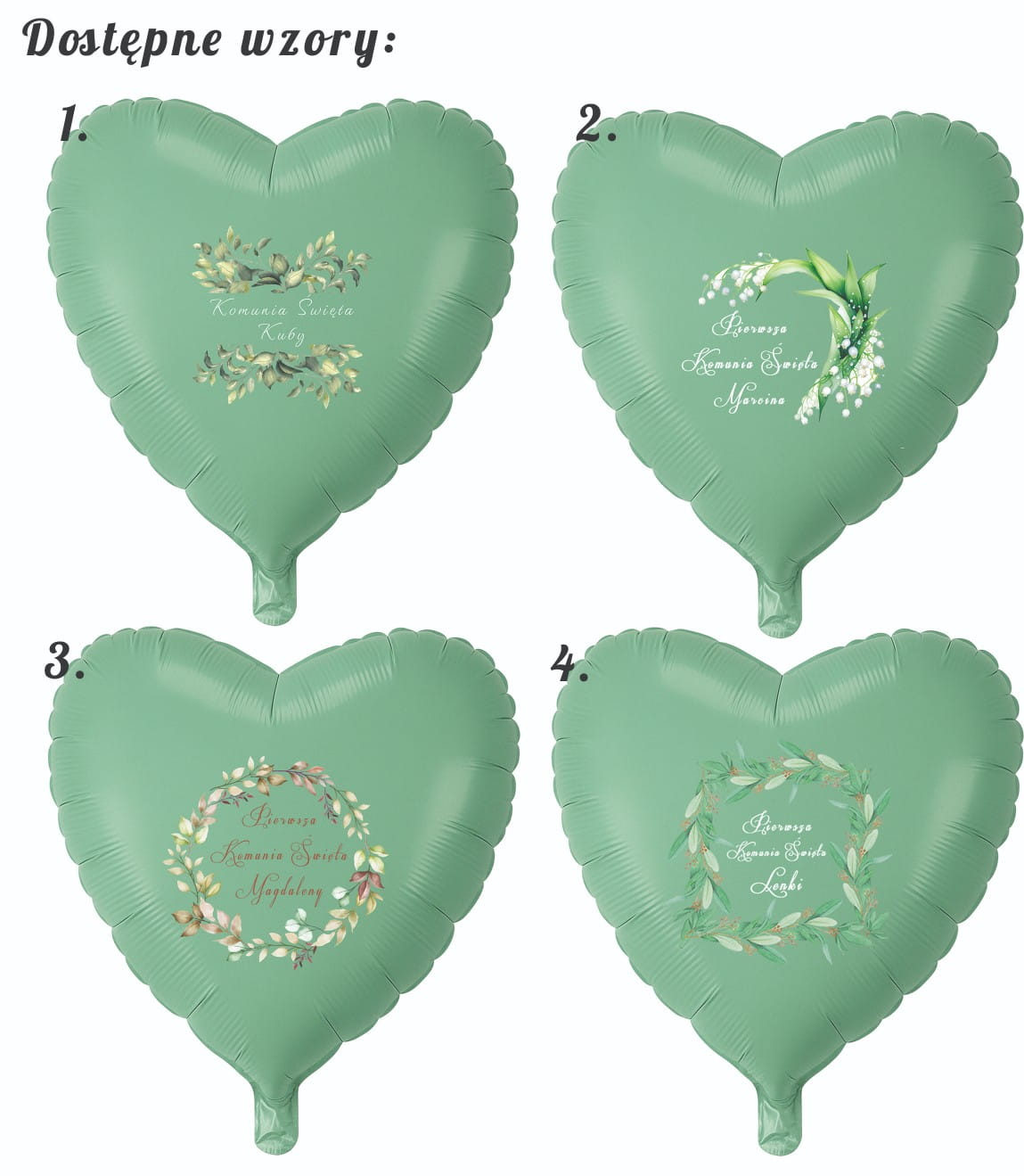 Elegancki balon w kształcie serca z możliwością personalizacji imieniem dziecka to stylowa dekoracja oraz pamiątka na Pierwszą Komunię Świętą. Nowoczesny zielony odcień nadaje wyjątkowego charakteru całej aranżacji. Możliwość wyboru spośród czterech subtelnych wzorów pozwala dopasować balon do estetyki przyjęcia komunijnego.
