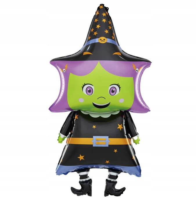 Balon foliowy z sympatyczną wiedźma to idealny element dekoracyjny w Halloween. Czarne ubranie i kapelusz ozdobione gwiazdkami i dyniami idealnie pasują kolorystycznie do fioletowych włosów i zielonej buzi. Czarne buciki i pończochy w paski na krzywych nóżkach dopełniają wizerunku postaci.