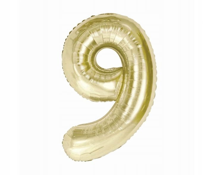 Balon foliowy w kształcie cyfry 9. Balon w kolorze szampańskim. Element dekoracyjny imprez urodzinowych, noworocznych i tematycznych. Niezastąpiony na urodzinach zarówno jedno jak i dwu cyfrowych. Balon można napełniać powietrzem lub helem.