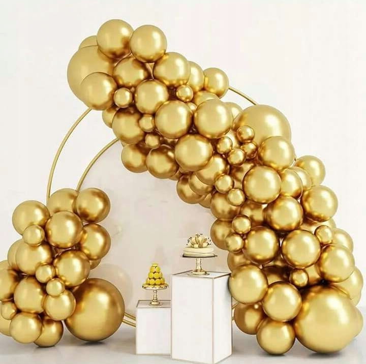 Ekskluzywne balony lateksowe w intensywnym złotym kolorze z efektem chromu. Idealne do tworzenia dekoracji balonowych, girland i bukietów na eleganckie przyjęcia.