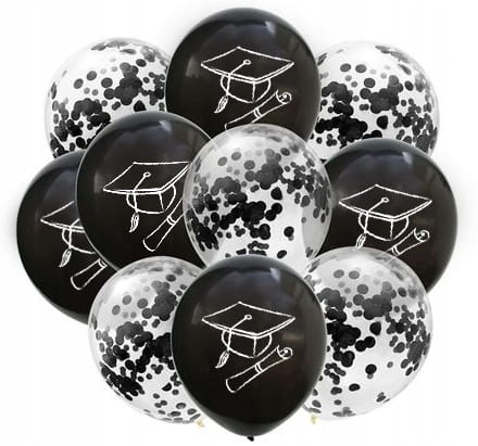 Bardzo mocne i wytrzymałe balony w kolorze czarnym z nadrukiem biretu oraz balony z czarnym konfetti. Idealnie nadają się na wszelkiego typu imprezy szkolne i nie tylko. Wykonane z naturalnego lateksu kauczukowego, biodegradowalnego w 100%.