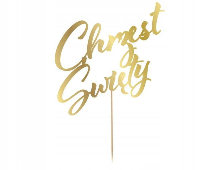 Toper na tort. Posiada wycięty laserowo napis Chrzest Święty. Wykonany z papieru w kolorze lustrzanego złota. Laserowo, precyzyjnie wycięty. Idealny dodatek do dekoracji tortu, ozdoby słodkiego baru lub jako dodatek do stroików.