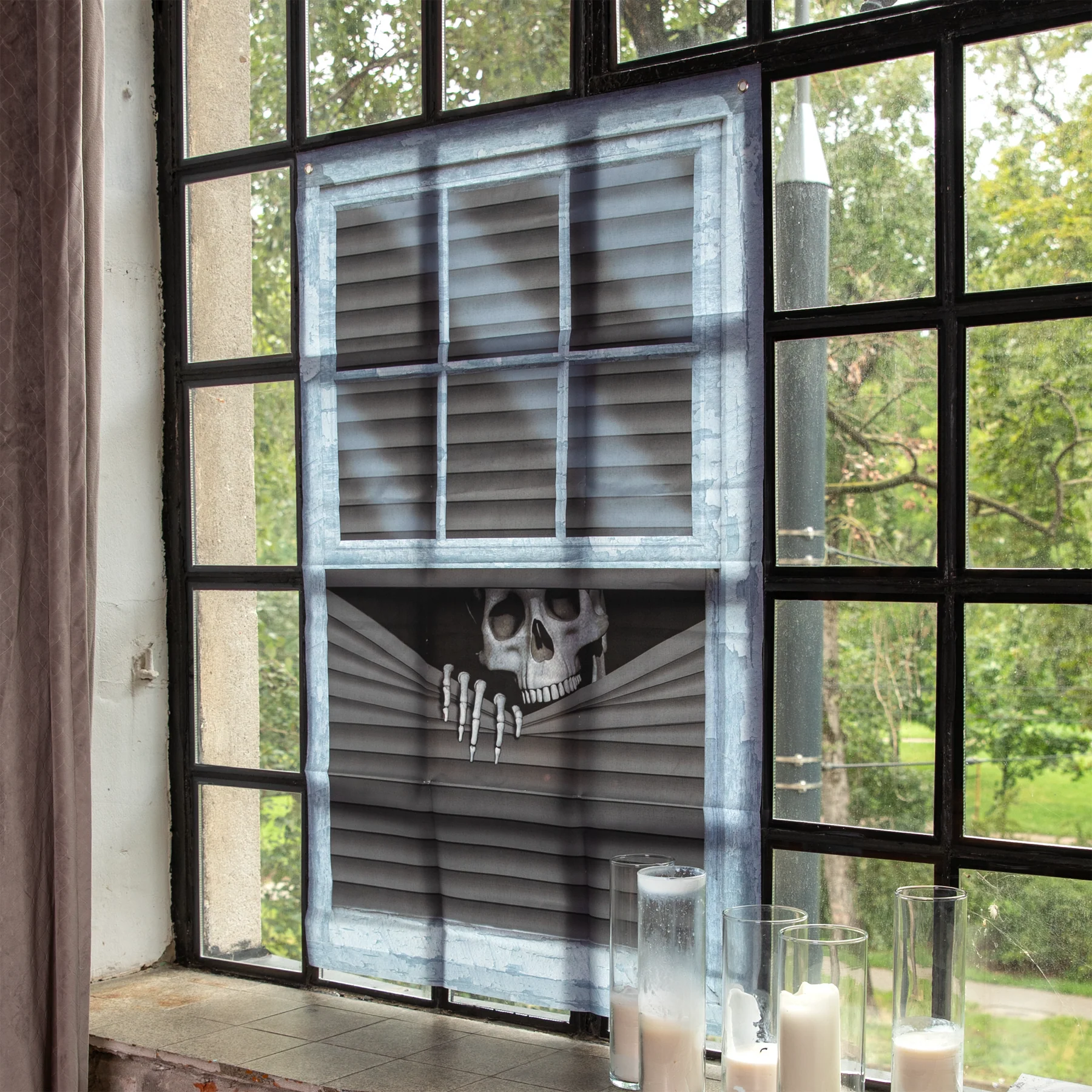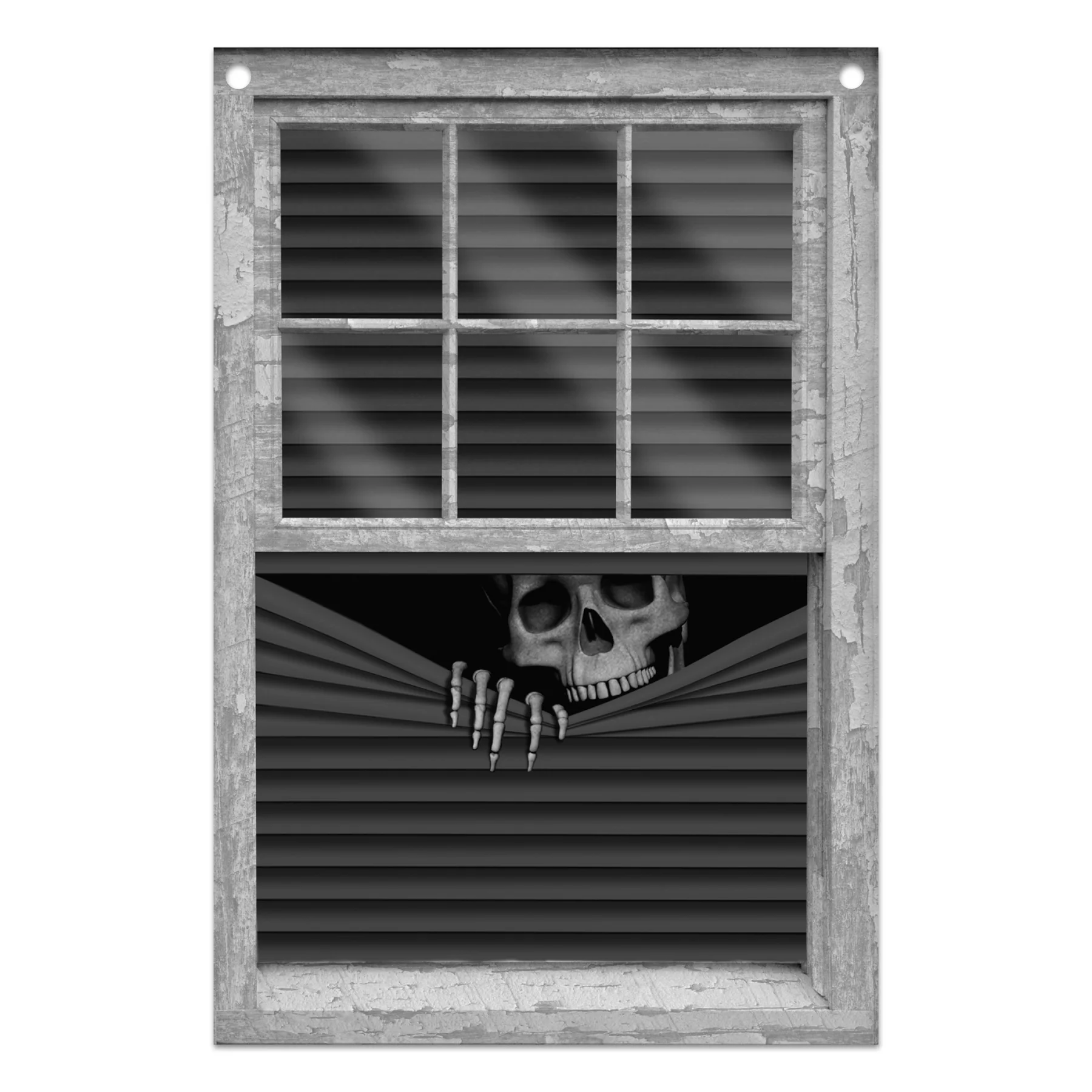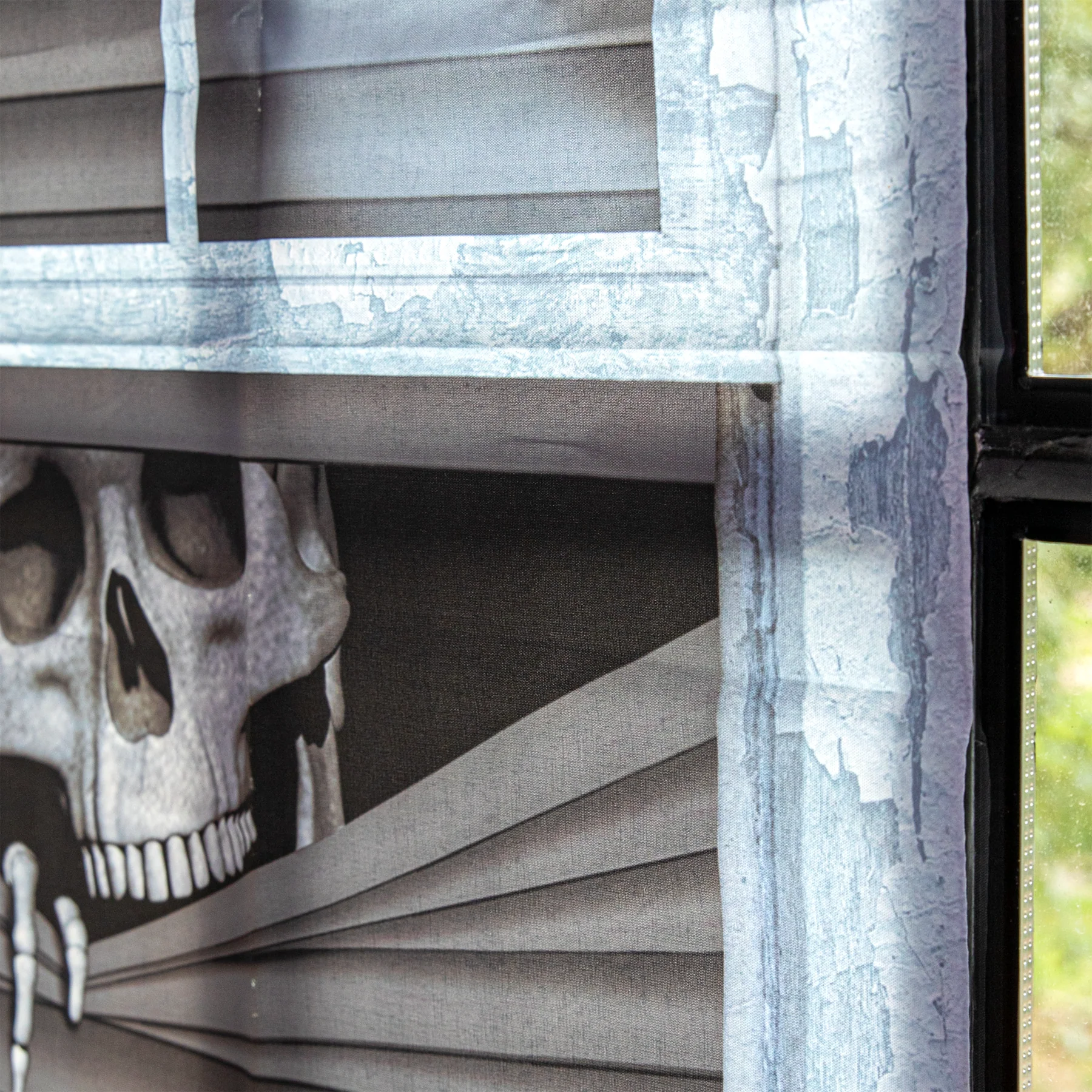Realistyczny baner z motywem czaszki zaglądającej zza żaluzji. Szybki sposób, by w kilka minut nadać wnętrzu mroczny klimat imprezy.