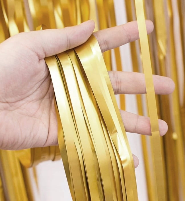 Kurtyna party w kolorze złotym. Przydatna na każdą okazję, urodziny, party, wesele, zabawy a także bale karnawałowe. Jest bardzo lekka, dlatego z łatwością można ją zawiesić w drzwiach / przejściu, oknach na ścianie lub ozdobić nią boki stołu.