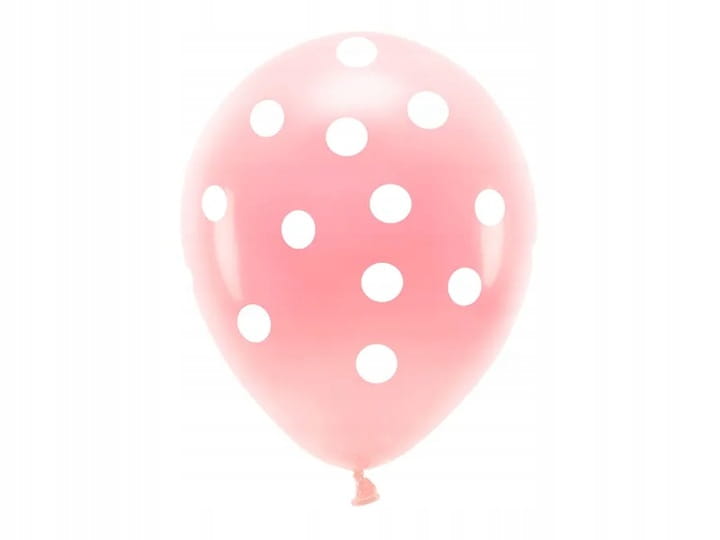 Balony Eco Kropki, pastelowe w kolorze różowym z pięciostronnym nadrukiem kropek w kolorze białym. Balony wykonane są z naturalnego kauczuku i ulegają biodegradacji w podobnym stopniu do liści drzew. Przy produkcji balonów Eco stosowane są wyłącznie naturalne składniki. Eco balony z pewnością dodadzą przyjęciu wyjątkowego charakteru oraz będą atrakcją dla gości. Nadmuchane powietrzem lub helem można przymocować do stołów i krzeseł lub powiesić pod sufitem.