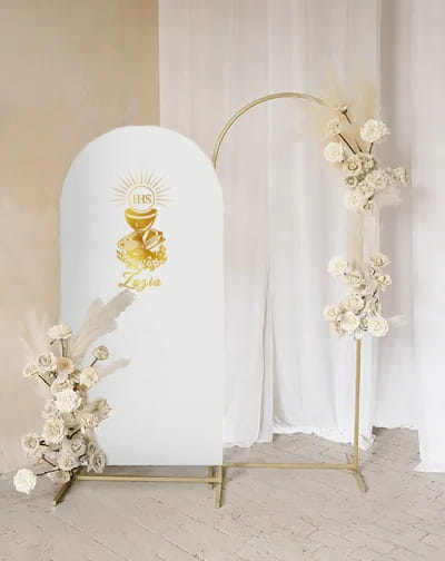 Zestaw dekoracyjny na Pierwszą Komunię Świętą, który składa się z eleganckiego złotego stojaka na tło oraz pokrowca komunijnego z personalizowanym napisem i grafiką Kielicha. Idealne rozwiązanie do stworzenia wyjątkowej i eleganckiej oprawy tego ważnego wydarzenia.