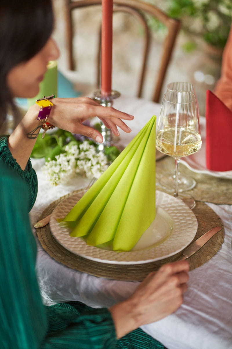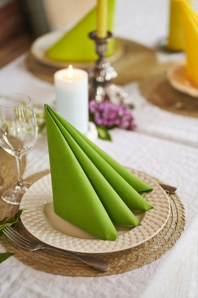 Serwetki w kolorze zielonej trawy gładkie wykonane z wysoko gatunkowej flizeliny. Papier Airlaid ma unikalne właściwości fizyczne, takie jak wysoką elastyczność, miękkość, odczucie, doskonałe wyczucie pionowe, o wyjątkowo wysokiej absorpcji wody i dobrej skuteczności zatrzymywania wody. Serwetka ta do złudzenia przypomina prawdziwą tkaninę. Serwetki flizelinowe są grubsze oraz sztywniejsze od papierowych dzięki czemu można je układać w różne fantazyjne wzory.