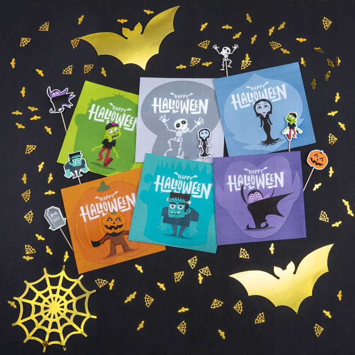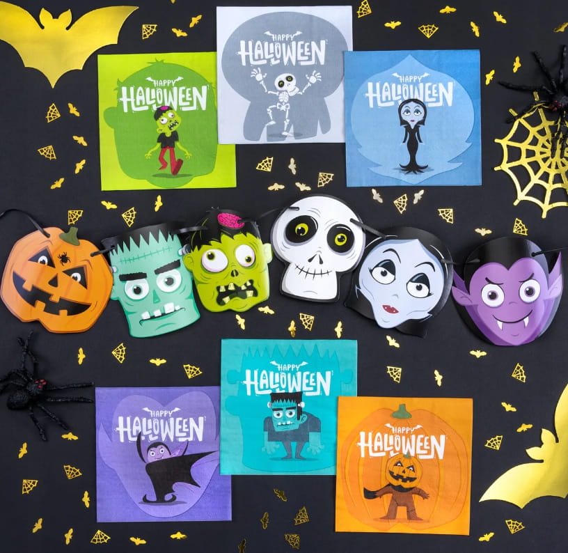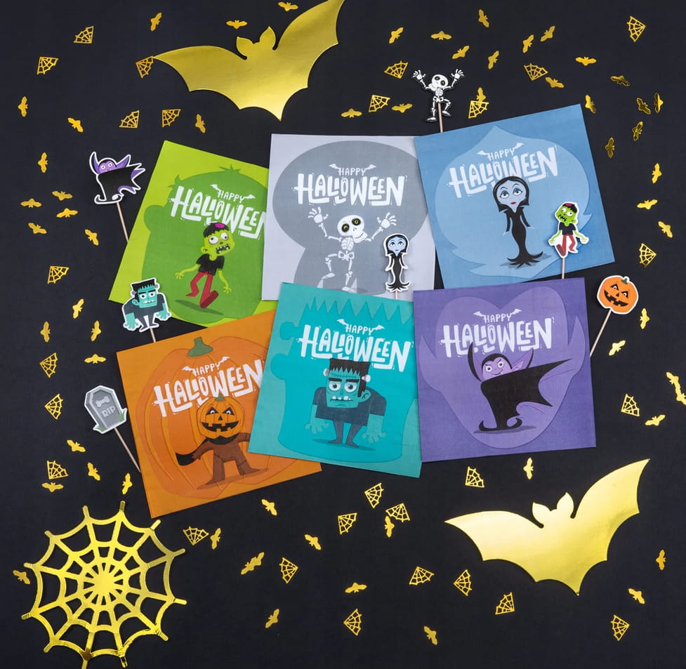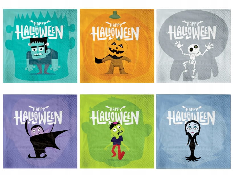 - W zestawie znajduje się 12 szt.uk papierowych serwetek z motywami Frankensteina, dyni, kościotrupa, wampira, zombie, wampirzycy.