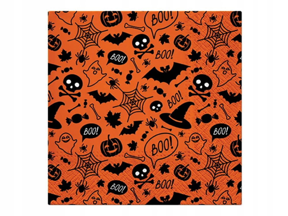 Serwetki papierowe na Halloween w kolorze pomarańczowym z nadrukiem nietoperzy, pajęczyn i duszków wprowadzą strasznie fajny nastrój na Twoją imprezę. Wyrazisty nadruk wysokiej jakości ożywi stół i doda kolorytu. Serwetki to mała dekoracja na Halloween, która potrafi zrobić wielką różnicę.