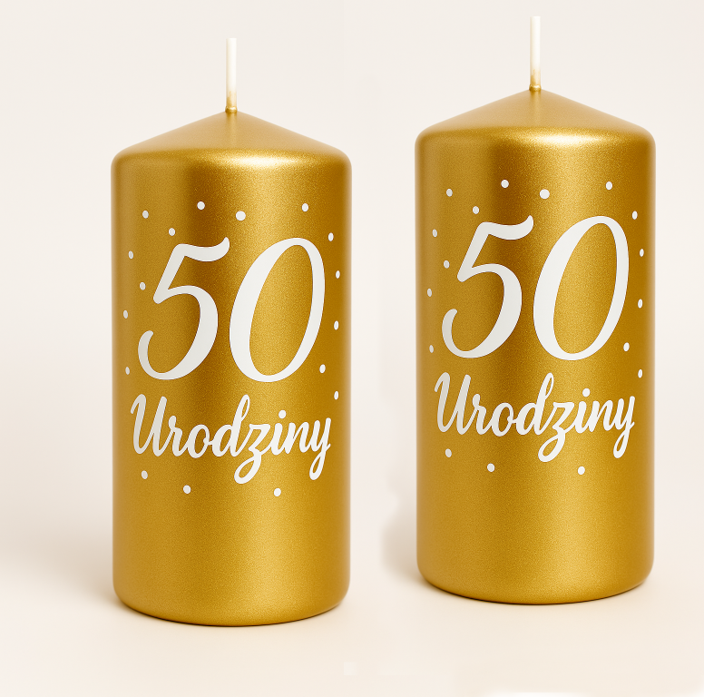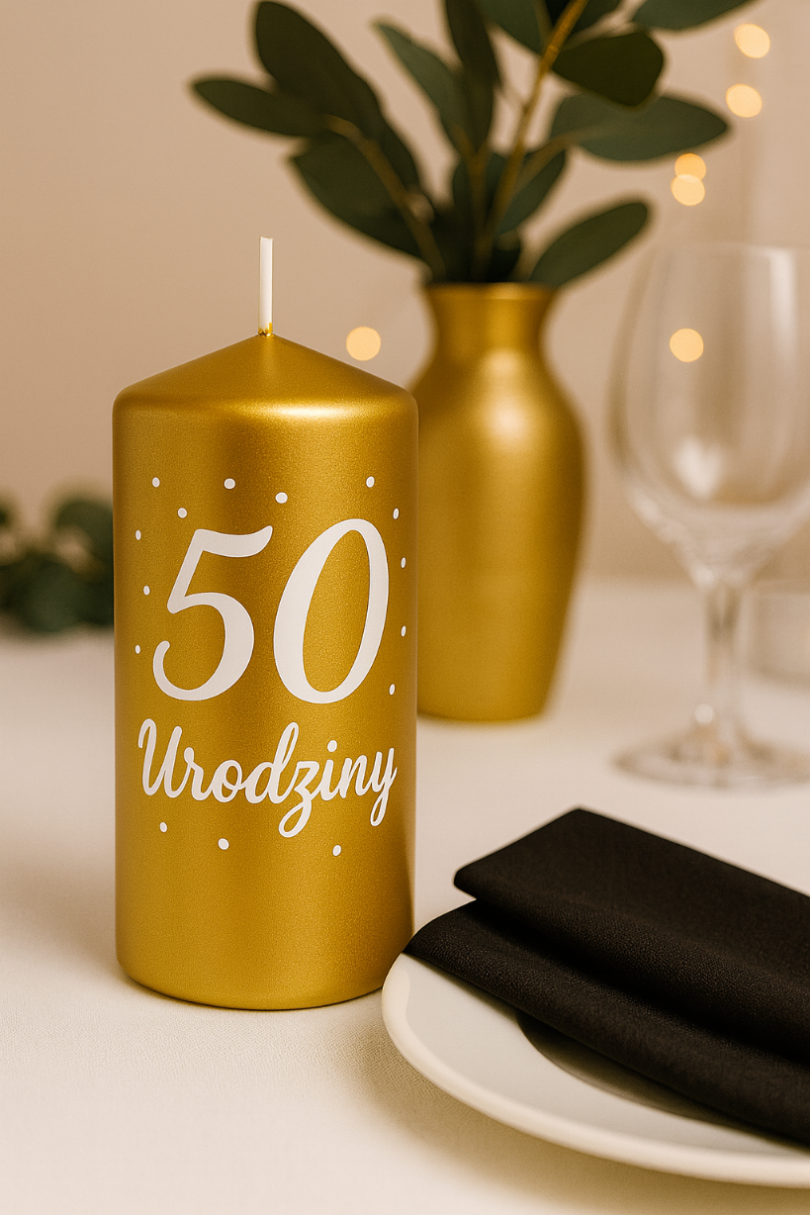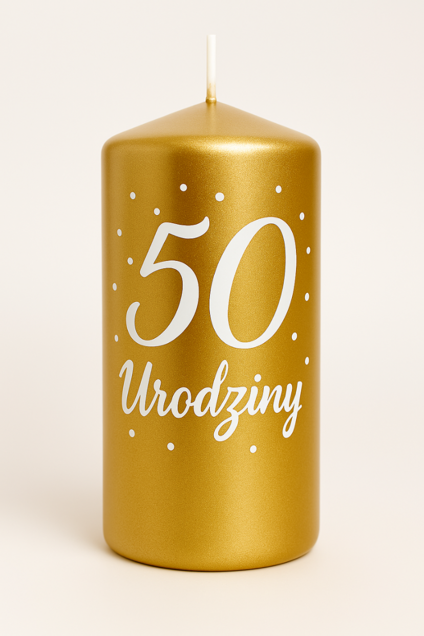 Elegancka, złota świeca w kształcie walca z napisem „50 Urodziny”. Grafika nanoszona jest trwałym, profesjonalnym nadrukiem bezpośrednio na świecy – nie odkleja się, nie marszczy i wygląda perfekcyjnie w świetle i na zdjęciach.