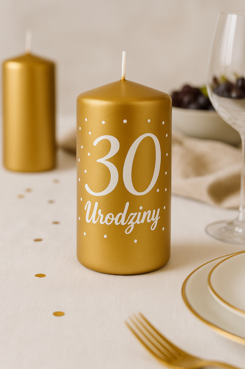 Elegancka, złota świeca w kształcie walca z napisem „30 Urodziny”. Grafika nanoszona jest trwałym, profesjonalnym nadrukiem bezpośrednio na świecy – nie odkleja się, nie marszczy i wygląda perfekcyjnie w świetle i na zdjęciach.
