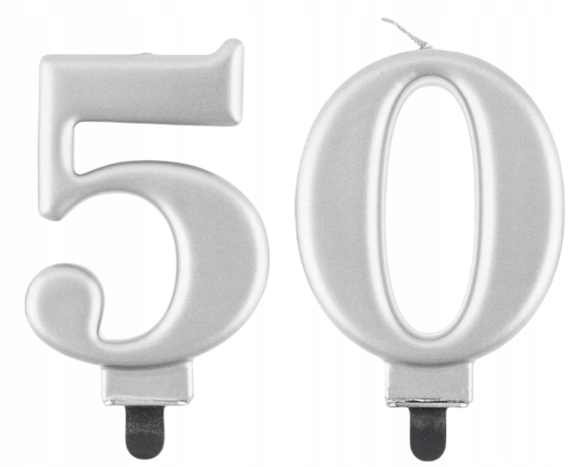 Elegancki zestaw świeczek urodzinowych tworzących cyfrę "50", w metalicznym srebrnym kolorze. Idealny dodatek do tortu na 50. urodziny, jubileusz lub inne wyjątkowe okazje. Świeczki w kształcie cyfr "5" i "0" nadadzą tortowi stylu i elegancji.