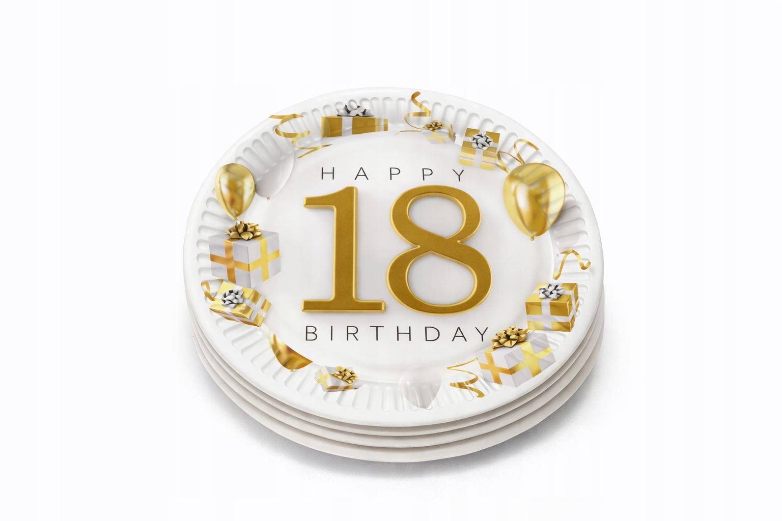 Eleganckie talerzyki papierowe w kolorze białym z dużą, złotą cyfrą 18 i napisem Happy Birthday. Świetnie pasują na 18. urodziny – do dekoracji stołu w stylu glamour, gold & white oraz do zestawów z kubeczkami i serwetkami w podobnej kolorystyce.