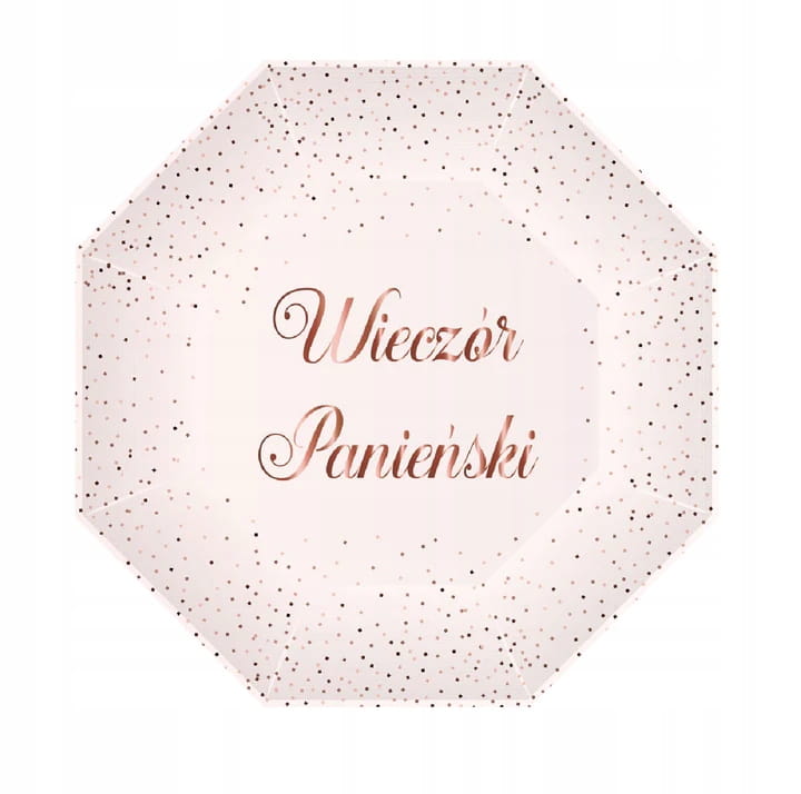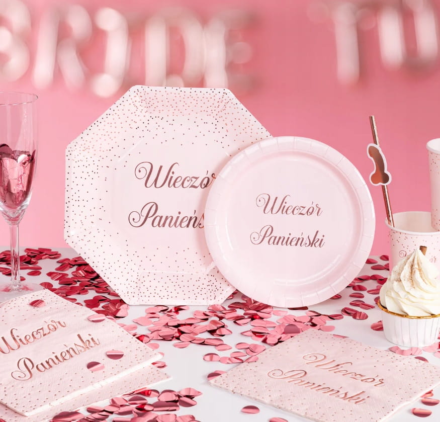 Różowe, ośmiokątne talerzyki na wieczór panieński z ozdobnymi kropeczkami i napisem w kolorze rose gold. Idealne imprezowe zestawienia kolorystyczne.