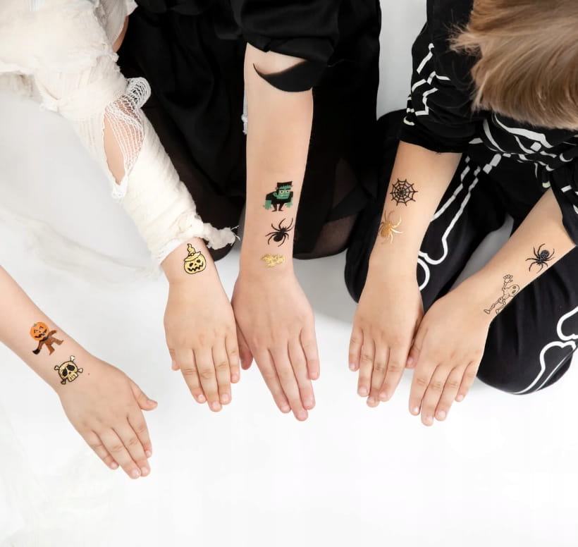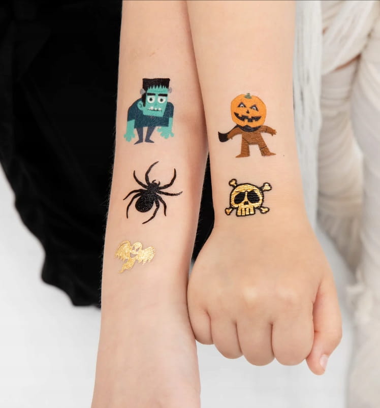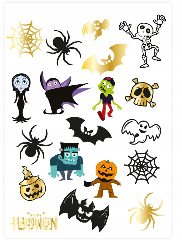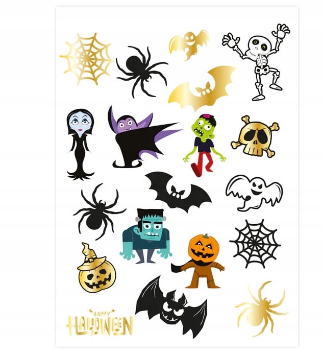 - W zestawie znajdują się kolorowe tatuaże z podobiznami kościotrupa, wampirzycy, wampira, zombie, Frankensteina i dyni.