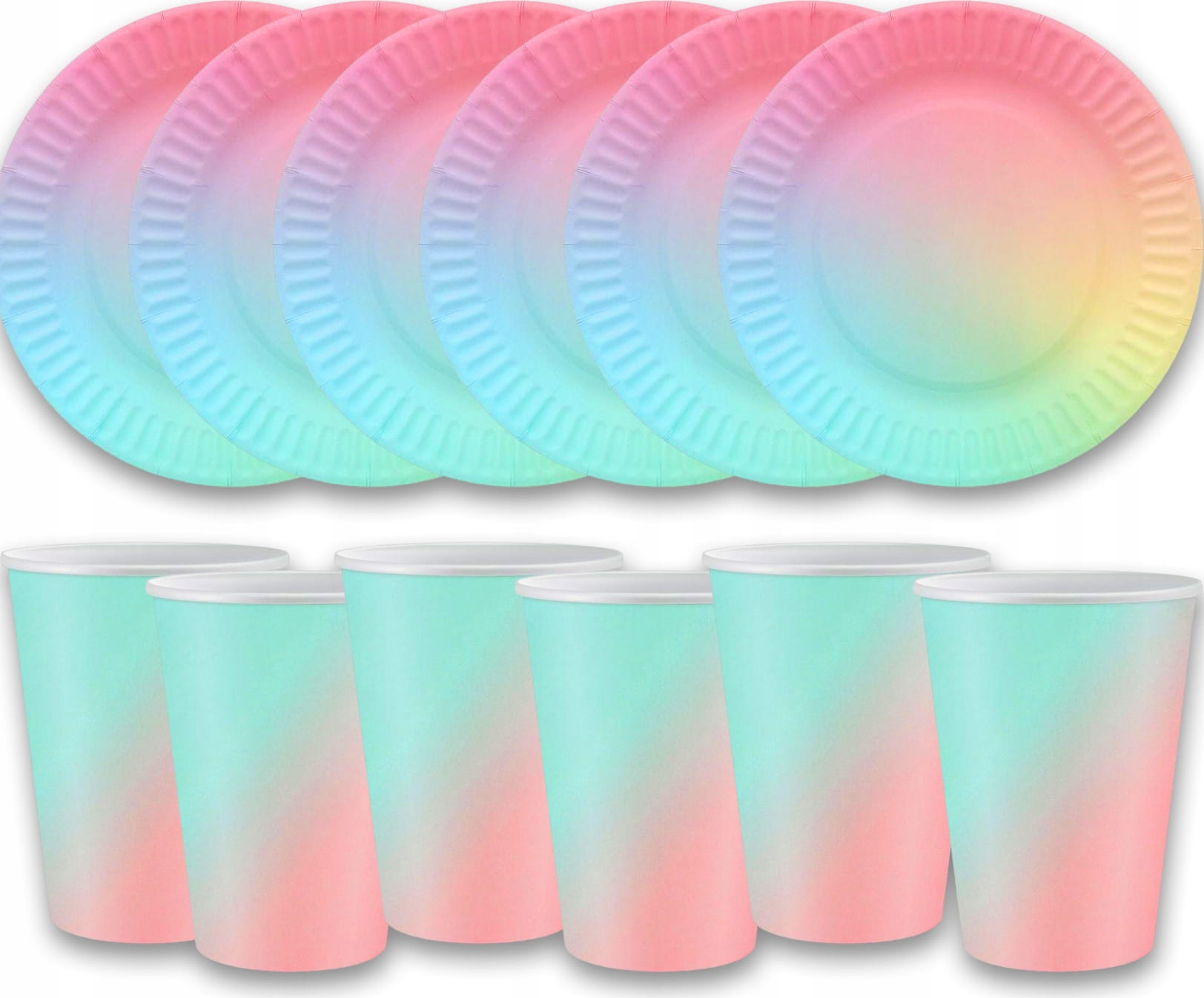 Stwórz niezapomnianą atmosferę na swojej imprezie dzięki zestawowi papierowych talerzyków i kubeczków w wyjątkowym, tęczowym ombre kolorze. Zestaw zawiera 6 talerzyków o średnicy 18 cm i 6 kubeczków o pojemności 266 ml, które idealnie pasują na różnorodne okazje, takie jak urodziny, spotkania rodzinne, czy pikniki. Subtelne, pastelowe przejścia kolorów dodadzą elegancji i uroku, a papierowe materiały sprawiają, że są ekologiczne i wygodne w użyciu.