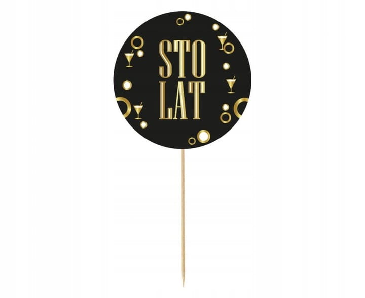 Zjawiskowy topper na tort urodzinowy w kolorze czarnym ze złotym błyszczącym napisem Sto Lat. Całość robi olśniewające wrażenie i sprawia, że tort wygląda na jeszcze pyszniejszy.