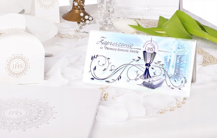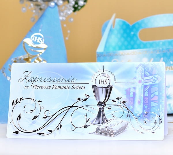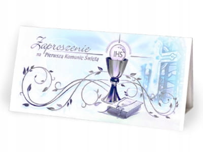 Błękitne zaproszenie komunijne wykonane na wysokiej jakości papierze z piękną grafiką komunijną. Delikatne i proste zdobienie sprawia, że zaproszenie jest eleganckie i gustowne. Do każdego zaproszenia dołączona koperta.