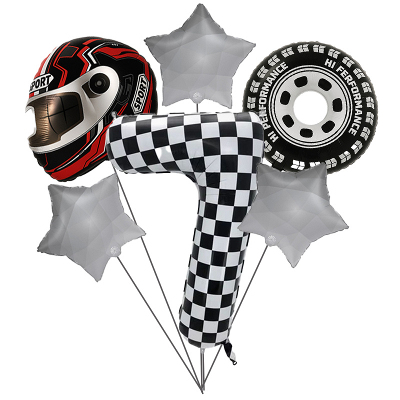 Efektowny komplet dla fana motoryzacji: cyfra 7 w szachownicę, kask, opona i 3 gwiazdy. Idealny na dekorację sali lub foto-ścianki.