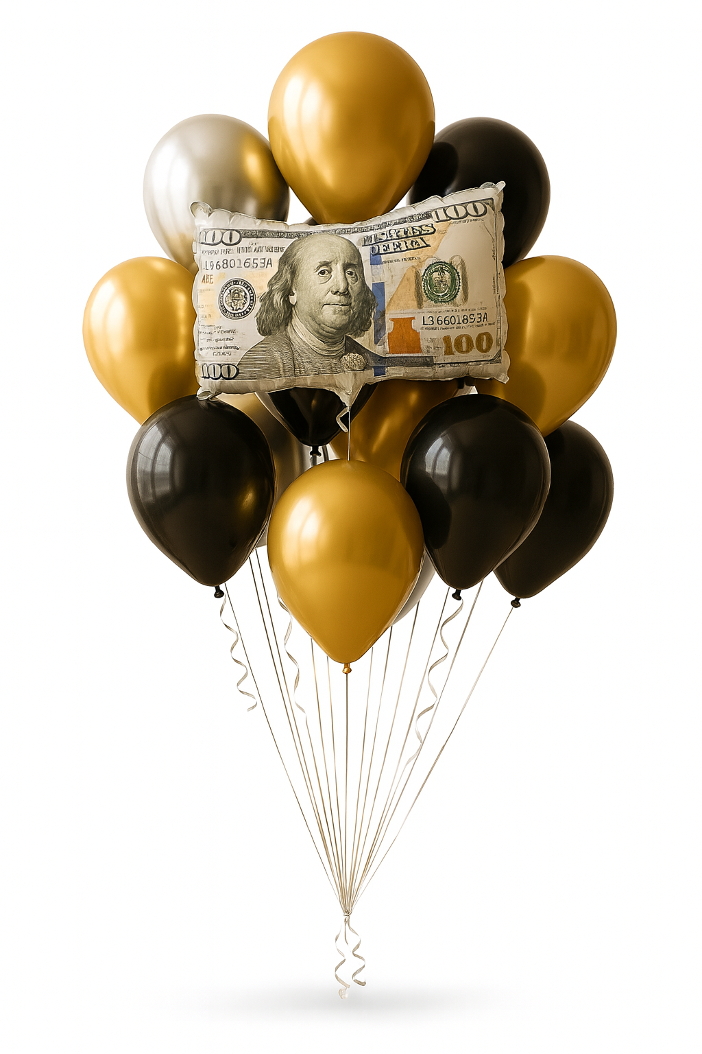 Zestaw balonów – BANKNOT 100$ + złote/srebrne CHROME + czarne