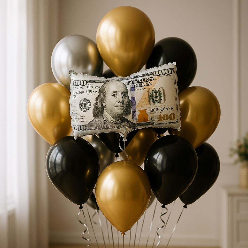 Gotowy, elegancki bukiet w klimacie casino/vegas: folia banknot 100$ oraz lateksy czarne i chromowane gold/silver. Idealny na urodziny, wieczór tematyczny, otwarcie lokalu czy sesję foto.