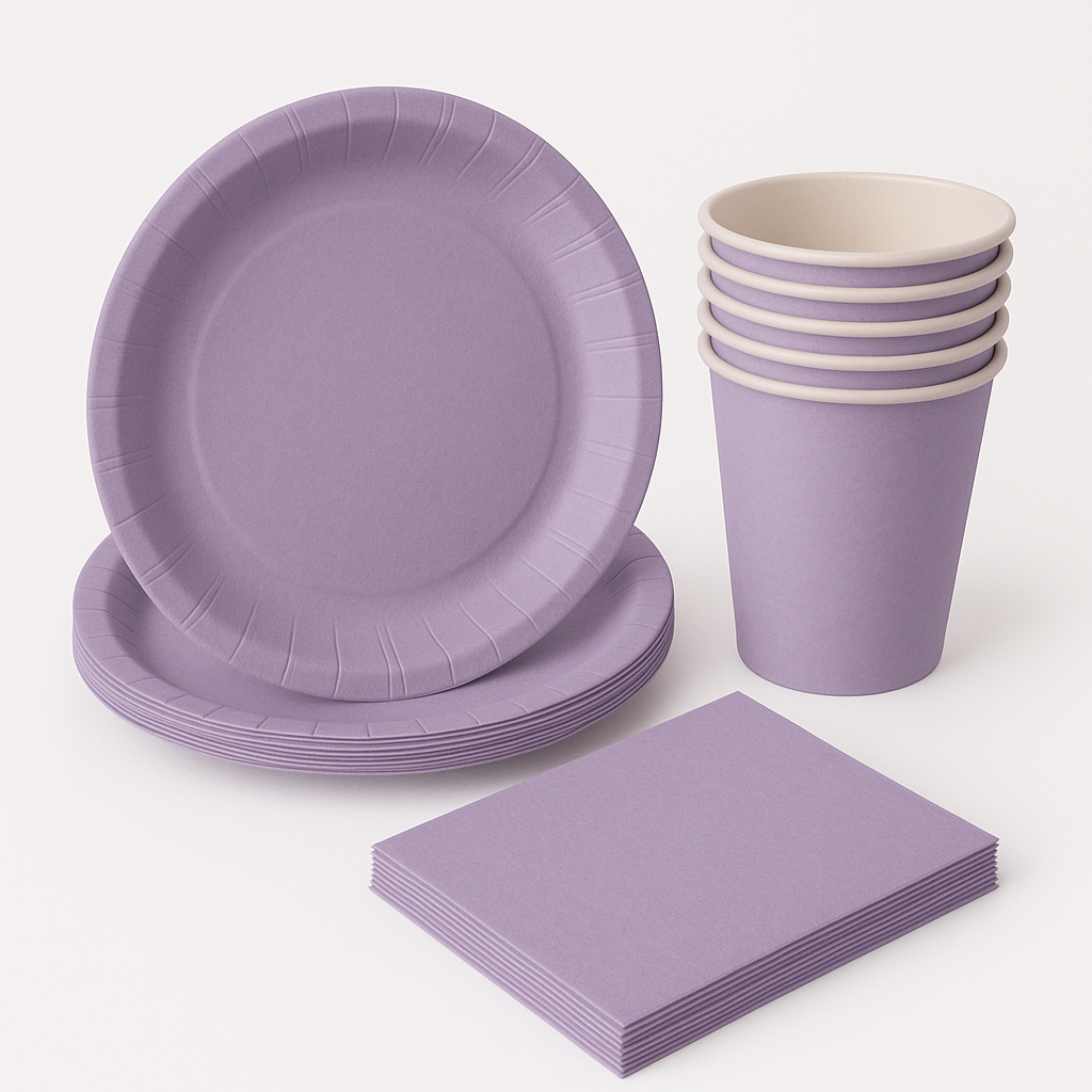 Stwórz elegancki i spójny wystrój stołu dzięki naszemu zestawowi imprezowemu w kolorze lawendy. Idealny na urodziny, wieczory tematyczne, przyjęcia ogrodowe czy imprezy firmowe.