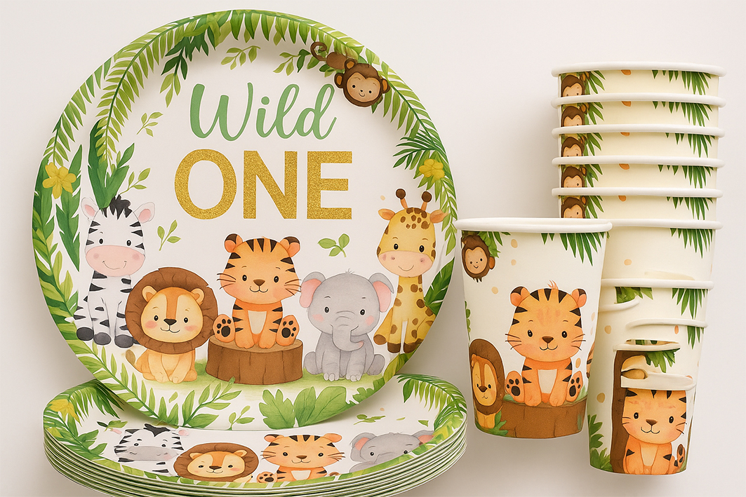 Estetyczny zestaw elementów stołowych z motywem zwierząt safari oraz napisem „Wild One”, przeznaczony do dekoracyjnej aranżacji stołu. Ilustracje inspirowane naturą w połączeniu z zieloną roślinnością tworzą spójną i harmonijną oprawę wizualną.