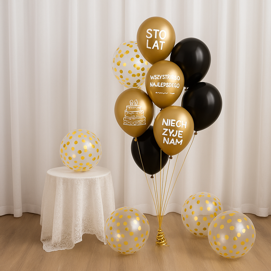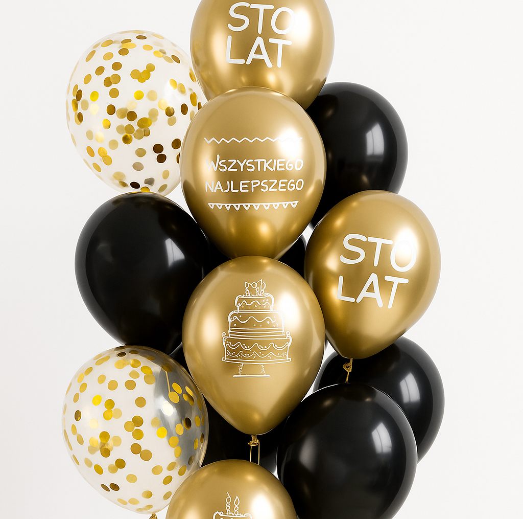 Elegancki zestaw balonów urodzinowych w modnej kolorystyce złota i czerni, idealny na wyjątkowe jubileusze i stylowe przyjęcia. Połączenie złotych balonów chromowanych z nadrukiem, klasycznej czerni oraz transparentnych balonów z konfetti tworzy efektowną dekorację, która od razu przyciąga wzrok.