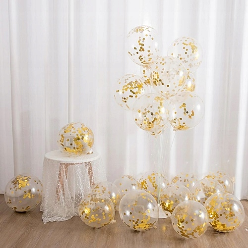- przezroczyste balony z złotym konfetti – modny, imprezowy akcent