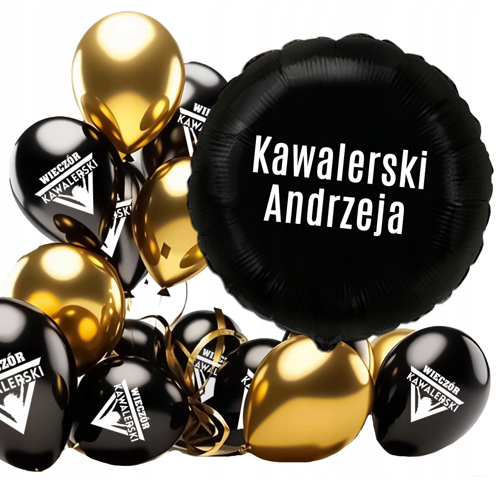 Zestaw balonów na Wieczór Kawalerski, personalizowany czarno-złoty. Imię